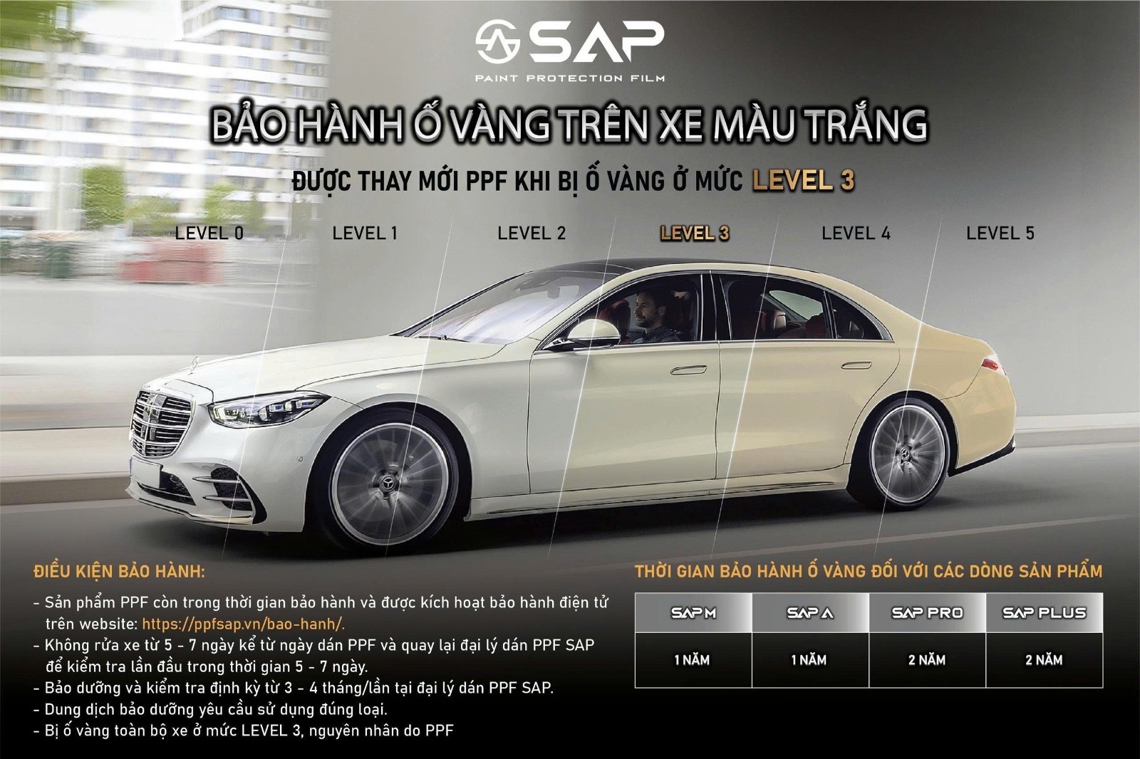 - Bảo hành ố vàng khi tấm màng phim PPF SAP bị ố vàng ở mức LEVEL 3. Chỉ bảo hành khi xác nhận màng phim PPF bị ố vàng chứ không xác nhận qua màu sơn xe.